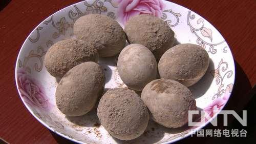在曾宇的家鄉(xiāng),土辦法做皮蛋不用石灰,而是用食鹽、草木灰、茶葉末混合,配成料水來腌鴨蛋。然后再用黃泥包裹,這種土辦法做的皮蛋,和市場上用石灰腌制的皮蛋,從外觀到口感都有很大不同。
